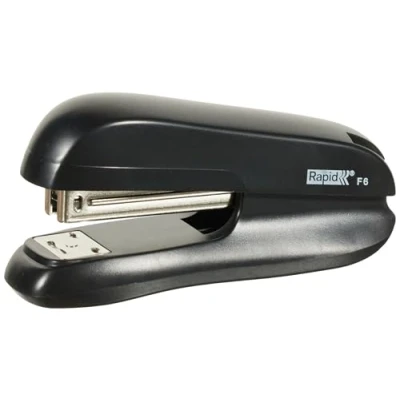 Compact stapler for stapling up to 20 sheets of paper (80gsm), Ideal for everyday stapling at home, in the office or at school Adjustable anvil provides stapling and pinning functions in one stapler plus stapler can be used for tacking, Robust metal mechanism with plastic case for comfortable and precise stapling Compatible with Rapid 24/6 and 26/6mm standard staples, Quick and easy top loading staple refill mechanism, Small and lightweight making it easy to store in a bag, on desktops or in drawers Features a 55mm paper insertion depth for flexible stapling, 5 year guarantee when using Rapid staples Contents: 1 x Rapid F6 Half Strip Stapler, Metal and ABS Plastic, Black, Dimensions (WxHxD): 62 x 40 x 126 mm, Weight: 110 g, 5000268