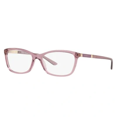 Brand: Versace Model: 3186 Style: Full Rim Rectangular Frame Color: Transparent Violet- 5279 Size: Lens-54 Bridge-16 B-Vertical Height-35 ED-Effective Diameter-57.6 Temple-140mm Gender: Women's Frame Material: Plastic Bridge Design: Saddle bridge Geofit: Global Base: Base 4 2-Year Manufacturer Warranty Made In: Italy