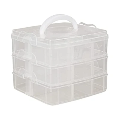 Organise all your craft supplies with this multifunctional three-tier box, the compartments can be tailored to your needs, the two top trays can be divided into up to eight separate compartments, removable dividers are included so you can create multiple storage options for beads, wire, tape, thread and brushes, ribbons and embellishments, your jewellery making kit and for all your art and needlework materials, the bottom tier offers enough space for modelling tools, craft knives, scissors, pliers, glue and pens An ideal portable organiser with handle for all your valuable scrapbooking, jewellery making or sewing necessities, with the translucent stackable tiers your craft accessories are easy to locate and the two sturdy latches on each tray ensure that your arts and crafts supplies are safe and secure This space-saving storage solution enables convenient storing and the compartment trays can be expanded to meet your needs, just stack and connect units together to build your own custom storage item, that way have your materials organised and your craft desk decluttered A multi-purpose hobby box suitable for keeping your electronic accessories like earphones, chargers and batteries neatly arranged or organise your office items with these handy storage containers, this compartment box makes also a perfect sewing box and we are sure you will find even more uses for it around your home External dimensions: 23,1 x 15,6 x 18,5 cm (9” x 6” x 7 3/8” approx.) Two trays with up to 8 adjustable compartments One tray with one large compartment in the size of 15,6 x 18,5 x 6 cm (6” x 7 3/8” x 2 3/8” approx.)