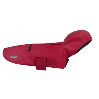 SPACE SAVER WITH HOOD: Easy to fold up and take anywhere, this dog raincoat features a handy hood that protects your dog's head from rain and wind, ensuring complete protection in all weather conditions. PROTECTION: Made with a wind resistant fabric, the raincoat offers an effective barrier against gusts, keeping your dog warm and protected even in the harshest weather conditions. The design is particularly practical for winter trips or in exposed areas. SAFETY GUARANTEED: The reflective bands built into the raincoat increase your dog's visibility in low light conditions, such as at sunset, at night or on cloudy days. Ensures added safety allowing your dog to be easily detected from afar IDEAL FIT: The adjustable elastic bands for the back legs ensure a stable and snug fit, preventing the raincoat from shifting or curling during dog movements. This provides optimal comfort and complete freedom of movement. Measurements: The Diran waterproof coat is available in red colour and in sizes with back length of 65 cm, chest circumference of 94 - 96 cm and neck circumference of 50-54 cm. Perfect for large and giant dogs.