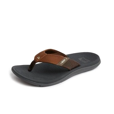 These flip flops are designed for epic moments and quiet ones -- chasing waves or studying the clouds from your hammock. Water friendly straps, a soft jersey lining and high arch support are easy on your feet. The bamboo inspired textured footbed and rubber cupsole lend awesome traction and stability. Water friendly vegan leather strap with super soft padded jersey lining|Super Soft compression molded EVA with High arch support, featuring a bamboo inspired texture for traction under your feet|Non-Marking rubber cupsole with palm frond design details to provide you the best traction and durability|