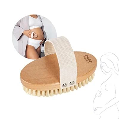 Manual massage brush with natural bristles Stimulates circulation and better absorption of healing active ingredients permet de can help prevent stretch marks and minimize water retention vergetures et de minimiser la rétention d'eau Practical hand loop for a secure grip Colour: Natural Material: beech wood, boar bristles Contents: 1 piece