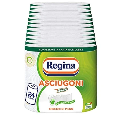 Regina Wish is the Decorated kitchen paper with hand sized sheets, its unique size allows you to use the right amount of paper as needed to reduce waste The pack of Regina Wish kitchen paper contains 24 2-ply rolls and each 150 sheets (tolerance ±5%) hand measured Regina Wish is a 100% Italian product, created with pure cellulose designed to help you keep your kitchen clean Regina kitchen paper respects the environment because it is produced exclusively from raw materials from responsibly managed forests and guaranteed by FSC forest certification Regina Wish is a Sofidel product, the first Italian company in the branch of paper for hygienic and domestic use, adhering to WWF Climate Savers since 2008, a program to reduce greenhouse gas emissions *tolerance 5±%