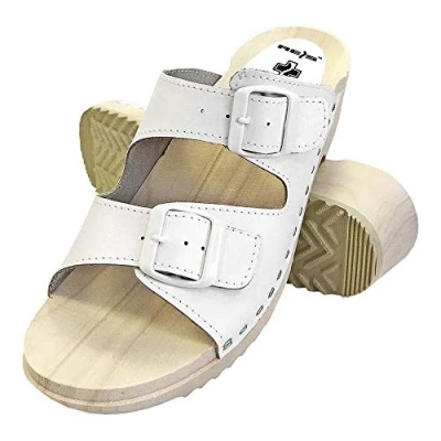 Made with the utmost care from high quality natural leather Leather upper with adjustable width - 2 straps with buckle closure Wooden sole with orthopaedic full profile that allows the foot to be positioned comfortably, but also absorbs and retains sweat A non-slip PVC tread on the sole to prevent slipping when walking