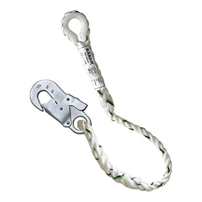Length: 1.5 m Ends of rope plaited and covered with a protective polyethylene sleeve Abrasion-resistant cap Loop with cap at one end and steel spring hook at the other end 12 mm diameter three-core polyamide rope equipped with a green and black wear indicator, 25 KN break-resistant, compliant with ISO 1140