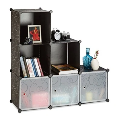 Storage solution: Shelf with 6 compartments - Provides room for books, CDs, clothes, shoes, etc. - Room divider for office, nursery and playroom - Black with decorative pattern Individual: This plug-in shelf can be assembled in many different variations - Can be expanded upon - Let your creativity run wild! Chic and functional: Provides ample storage space while taking up little space itself - Each square compartment is app. 35 cm - Ideal as a bathroom shelf, shoe rack or room divider Easy to clean and moisture-resistant: Dust and dirt can be easily wiped off with a damp cloth due to the insert able plastic shelves - Lovely for bathrooms and hallways Quick assembly: Quickly assembled thanks to the plastic connectors - No drilling required - Sturdy and flexible room divider