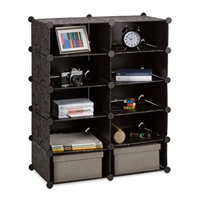 Versatile Interlock Shelf: Black Shelf with 10 compartments - Available in 3 colours - Provides room for books, CDs, clothes, shoes, etc. - Room divider for office, nursery and playroom Individual: Sideboard with 2 tiers or tall shelf with 5 tiers - Assemble according to your personal use - Can be expanded upon Ample storage: Provides ample storage space while taking up little space itself - Each compartment measures H x W x D: app. 17 x 35 x 35 cm - Height of compartments can be varied at will Easy to clean: Dust and dirt can be easily wiped off with a damp cloth due to the robust plastic shelves - Lovely for bathrooms and hallways Quick assembly: Quickly assembled thanks to the plastic connectors - No drilling required - Sturdy and flexible room divider