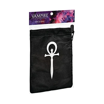 Keep your dice and other gaming accessories at hand in this premium quality Vampire: The Masquerade themed dice bag! The iconic ankh of independent vampire clans is featured on this dice bag, perfect for use while playing your Vampire story. Featuring high quality construction with a soft fabric exterior and protective liner, along with a locking drawstring clasp, your dice will be safe and secure. Perfect extra accessory that you can gift or keep for yourself. In Vampire The Masquerade RPG you are a vampire struggling for survival, supremacy and your own fading humanity., Manufacturer: RENEGADE GAMES STUDIOS