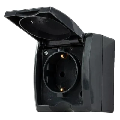 Surface-mounted socket simple. Areas of use: wet rooms, splash-proof (IP44) Surface-mounted socket for use in basement, workshop, garage, hall, stable etc. (socket simply outside - protected outdoor area) Socket housing glossy, lid matt Surface-mounted socket: 2-pin, 230V~, 16A, 3680W. Box contents: 1 socket Socket dimensions (L x W x H): 72 x 68 x 55 mm, weight: 88 g