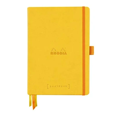 RHODIA 118585C Daffodil Bullet Journal Goalbook Rigid Notebook A5 Dotted Dot 240 Pages 90g White Clairefontaine Paper 3 Ribbons, Elastic Closure Faux Leather Cover