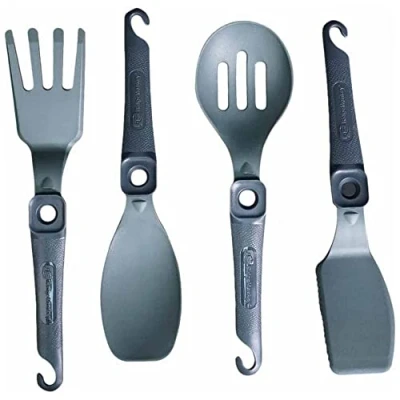 AmazonRidge Monkey Cookware Q-Lock folding handle system, easy to clean Heat-resistant, dishwasher-safe Hanging storage hook Box contents: fork spatula, serrated edge spatula, spoon, slotted spoon