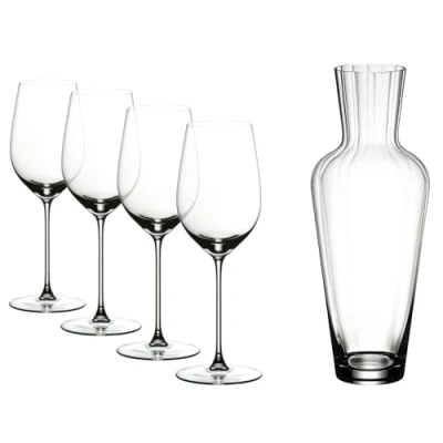 Riedel Veritas White Wine Glasses Set Do you love good wine? Then you definitely need to try the Riedel Veritas white wine glasses set! These glasses are made of ultra-thin crystal glass and are ideal for white wine. The shape of the bowl ensures that the fruity flavors are perfectly balanced, and the oxygen that enters the glass activates these flavors even more. And now available with a decanter for a limited time! Curious which wines you can serve in this glass? From Riesling to Primitivo, they all fit perfectly in these glasses. Maintenance & Accessories To keep your Riedel Veritas decanter in perfect condition, cleaning granules and polishing cloths are essential accessories. * Cleaning granules are specially developed to safely and thoroughly clean the inside of decanters and narrow glasses. They remove wine residue and deposits without scratching and without the use of harsh cleaning agents. * Polishing cloths ensure a streak-free and shiny result after washing and drying the decanter, ideal for crystal glass and high-quality wine accessories. At Cookinglife, you'll find matching cleaning granules and polishing cloths, so you have everything you need for optimal maintenance and years of enjoyment from your decanter. What's in the box? * 1x Riedel Mosel Decanter 750 ml * 4x Wine Glasses 459 ml Interested in buying a set? Then take a look at our entire collection of Riedel Veritas wine glasses or our other products from this top brand.