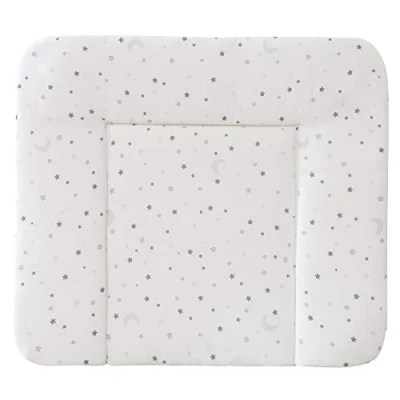 The roba changing mat in a classic star magic design in grey with its 3-sided raised edge ensures safety and security when changing and maintaining The surface fabric of the PU-coated changing table mat is particularly skin-friendly and cuddly The cotton polyester blend changing mat and phthalate-free PU coating is softly padded so your baby lies comfortably All materials used in the PU-coated changing table mat are tested for harmful substances, certified. The surface of the changing mat is wipeable and easy to clean The dimensions of the roba changing mat of 85 x 75 cm, height approx. 4 cm, are adapted to most standard changing tables