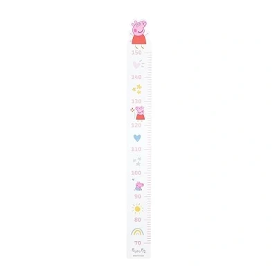 GROWTH RULER UP TO 150 CM: Scale of the height chart ranges from 70 to 150 cm - Allows easy tracking of your child's growth and development - Complements other products from the popular cartoon series. DECORATIVE CHILDREN'S HEIGHT CHART: Roba height chart made of printed wood - Use of skin-friendly food-grade colors - All materials used are tested for harmful substances and certified. EASY TO MOUNT & DECORATIVE: Easy installation of the children's height chart thanks to the notch on the back - Beautiful wall decoration for kids' rooms - A perfect gift for birthdays, Easter, or Christmas. PEPPA PIG DESIGN: Height chart featuring the series' heroine Peppa Pig - Perfect for room decoration for girls and boys - Loving print with stars, rainbows, and hearts. SPECIFICATIONS: Dimensions H 100 x W 10 cm - Thickness: 1 cm - Material: wood (painted MDF) - Easy cleaning with a damp cloth - Expandable with other products from the Peppa Pig series by roba.