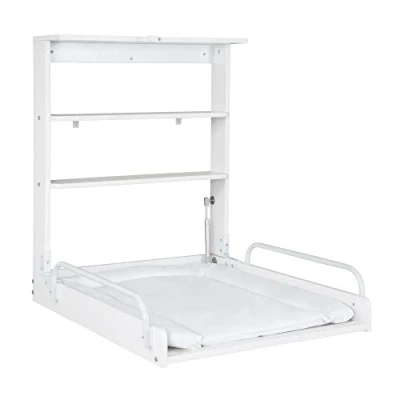 The folding changing shelf comes with a changing mat. Thanks to the side protection, the wall changing shelf is a safe changing place from birth up to a weight of 15 kg. The wrapping table can be easily opened and closed with one hand and glides gently and safely up and down thanks to its shock absorber hinge. The shelves and the top shelf on the back wall of the wall shelf offer plenty of space for necessities, which can also be stored safely and well organized when the changing plate is folded up. The folding changing shelf is developed and produced according to the latest safety standards. All materials used are certified and regularly tested.
