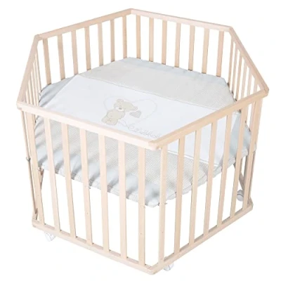 roba Hexagonal Playpen in Natural Wood Crawling Grid with Insert Lover Bear Motif 3 Way Height Adjustable Mobile on Wheels