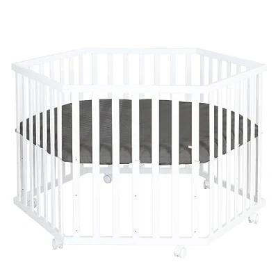 High-quality plaster: hexagonal wooden baby playpen – base material: plywood and lying surface: MDF – mobile thanks to 6 wheels including locking function – flat rods rounded, ecologically processed and splinter-free Includes protective insert: high-quality, padded insert in the design 'graphite quilted' included. Outer material: vegan leather (PU leather). Inner lining: polyester fleece (approx. 2 cm thick) - easy to clean with a damp cloth Height adjustable: the baby playpen can be easily adjusted to three different height levels, back-friendly for parents, growing construction for different development phases, age range: from 0 to 24 months Safe and certified: baby playpen developed according to current safety standard EN 12227:2010-12 – all paints used are food-safe, skin-friendly and are regularly checked during production – load capacity: 15 kg RUNCH SPECIFICATIONS: Dimensions: H 72.5 x W 118.5 x D 103.5 cm (rung spacing: 5.5 cm) - Height adjustment steps: 10, 25, 40 cm - Height of brake wheels: 5 cm - Colour: white lacquered wood - Protective insert: anthracite