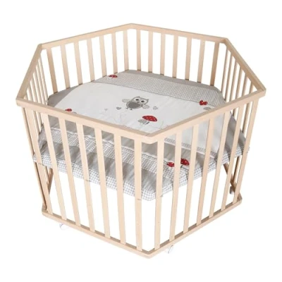 Hexagonal wooden trellis: cuddly, padded textile insert and secure flat bars for best protection Large playing and cuddling surface: 3-way height-adjustable base for back-friendly play Wheels with brake: ensures secure stability and flexible mobility Tested safety: complies with DIN EN 12227:2010-12, all materials certified, food safe and skin-friendly Durable and resilient: for children from 0-24 months, can hold up to 15 kg, ideal playground from birth