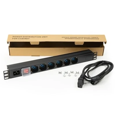 Universal socket strip with 6 universal sockets for rack cabinets, with removable C14 plug. 6 universal sockets UNEL 2P+T 16A socket 35 degrees For powering devices in the rack cabinets Attaches to the side bars (reversible) with the included brackets Screws for installation on the 19 inch posts are also included.