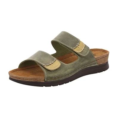 Super comfortable women's mules from the house Rohde! Upper material made of very soft and fine nubuck leather. Adjustable Velcro straps for perfect width adjustment. Great additional detail - equipped with a memory foam footbed. Lightweight, two-tone and extremely comfortable PU wedge sole.