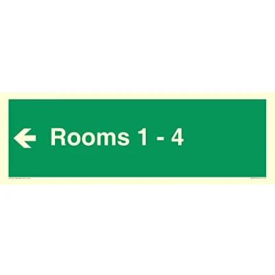 E913 : Left arrow (90 deg supplimentary) This sign is made from vinyl photoluminescent sticker Landscape Letterbox Sign Text: Rooms 1 - 4