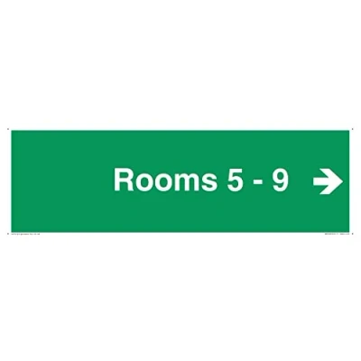 E909 : Right arrow (90 deg supplimentary) This sign is made from plastic semi-rigid 1mm 1mm thin plastic sign, can be screwed, stuck with adhesive, or attached with cable ties. Not suitable for hanging. 4mm Corner holes Landscape Letterbox Sign Text: Rooms 5 - 9