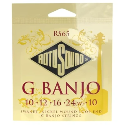 Rotosound Strings for banjo, banjo strings set of 5. Banjo RS65 Medium 10 Swanee G, nickel wound .010"-.010" Nickel wound Sling / loop end Rotosound has been manufacturing instrument strings and accessories for more than 60 years in the family-run factory in Kent, England. As the inventor of the roundwound bass string and the founder of rock 'n' roll sound, the company has been at the forefront of the international music industry since 1958. Rotosound strings are synonymous with the British Tone and have been and are used by virtually all bands of the British Invasion, in Punk, New Wave, Rock, Brit Pop and Indie