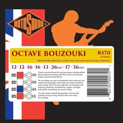 Rotosound Strings for Bouzouki, Bouzouki Strings GR. Bouzouki RS70 Medium 11 Athena, phosphor bronze .010"- 024 "w, octavated Loop, loop end Rotosound has been making instrument strings and accessories for more than 60 years at its family-run factory in Kent, England. As the inventor of the roundwound bass string and the founder of the rock'n'roll sound, the company has been at the forefront of the international music industry since 1958. Rotosound strings are synonymous with the British Tone and were and are used by almost all British Invasion, Punk, New Wave, Rock, Brit Pop and Indie bands.