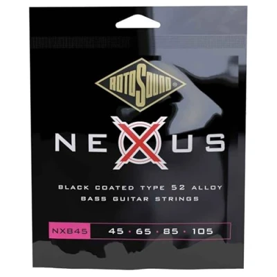 Black coated Ultramag,high magnetic type 52 alloy More power, sustain and a longer life than nickel or steel strings strong mids, silky-smooth black polymer coating Scale length medium (32''/810mm) to long scale (34''/860mm) Rotosound strings for electric bass NEXUS 52 ALLOY ROUNDWOUND COATED 4-str. NXB45 Custom 45-105