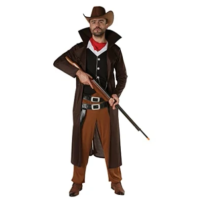Rubie's Cowboy Costume, Gunslinger Wild West Adults Costume Costume Includes Shirt with attached neckerchief, mock waistcoat and coat, brown trousers, hat and fabric belt with holsters Rubie's products are delivered in Rubie's Official Branded Packaging Rubie’s Official Licensed product tested to all required European and UK standards, including EN71 and REACH UK designed and sized product, please refer to sizing chart image for reference Ideal Dress Up for Themed Parties, Halloween and World Book Day, Manufacturer: Rubie's