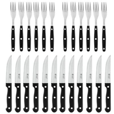 Russell Hobbs COMBO 4796 24 Piece Steak Knife & Fork Set Tableware Service for 12, Knives and Forks with Stainless Steel Blades, Serrated Set, Sharp Meat Knives, Ergonomic Handles, Black