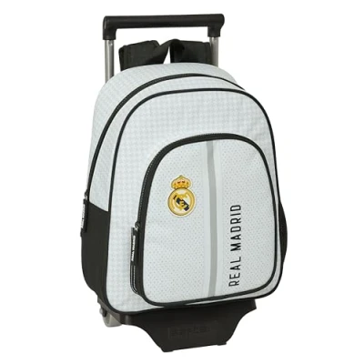 AND QUALITY: REAL MADRID 1. EQUIPMENT 24/25 Official removable school backpack with 2 years UNIQUE DESIGN: Made of very durable polyester material and smooth zippers. Easy-care SPACIOUS & LIGHTWEIGHT - Side bottle pocket and large front pocket ERGONOMICS AND COMFORT: Ergonomic padded shoulder straps with top handle. Trolley made of polypropylene, painted steel and very durable PVC. Safta mounting system. Dimensions when open: 27 x 10 x 67 cm STRENGTH AND DURABLE: This product is specially designed to last, made with high strength materials to ensure it can be used in all kinds of activities, ensuring its functionality