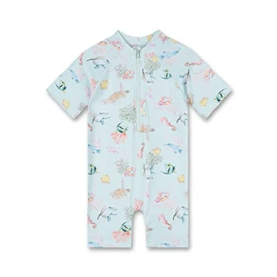 Elastic material made of polyamide Short sleeves and legs as well as a high collar prevent direct sunlight Practical zip in the front Colourful underwater print