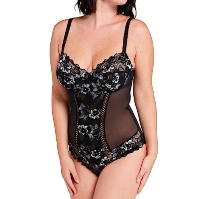 Body with reinforcements and 3 discs. Construction: comfort and support. Expandable textronic floral lace with scales, tulle and microfiber: refined and glamorous appearance. Tricolour knitting: elegance. Adjustable straps and opening pressure pimples in the crotch: practicality. Standard certified 100 by Oeko-Tex