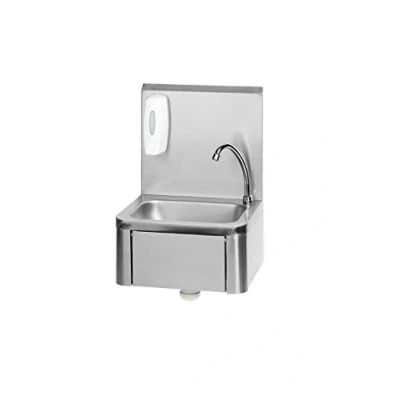 With knee operation. Movable tap. With non-return valve. Splash guard, incl. Soap dispenser. Stainless steel. Connection to the water pipe - 1/2 inch Cable included.