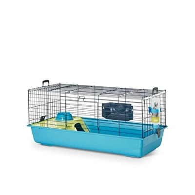 very sturdy blue coated wire cage, with plastic tray, size 100 x 45 x 50cm cage includes all basic equiptment, hay rack, feed bowl, house, water bottle and clips wire spacing 25.6mm