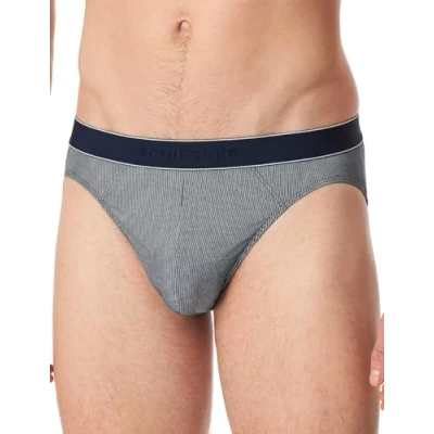 navy striped rio briefs for men Contrasting woven elastic waistband with two white stripes and Schiesser print Temperature and moisture regulating thanks to innovative cavity technology Particularly breathable and quick-drying material In perfectly fitting, elastic single jersey quality with 30% modal