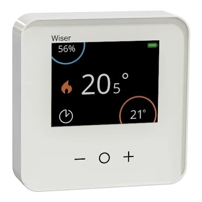 Connected room thermostat to control all types of heating on your Wiser system Easy to use, three touch buttons to access and change settings Indicators of desired temperature, current room and current humidity Wireless Thermostat Wall-mounted or free-standing installation