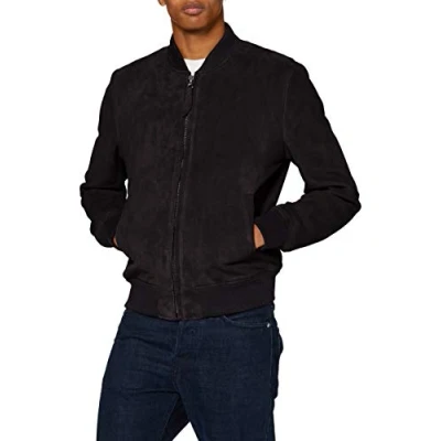 Casual bomber jacket 2 lower pockets, 2 inside pockets, knit collar, waist, and cuffs Standard fit Goat suede