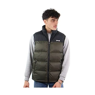 Unisex sleeveless puffer, shoulder yokes, hidden hood under collar Adjustable drawstring around collar and waist, Schott logo embroidery on chest,2 lower pockets, 2 inside pockets. Standard fit Body : 100% ripstop nylon, yokes : 60% cotton/40% nylon, polyester padding