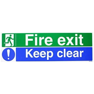 Seco Fire Exit Man Running Left, Exit, Exclamation Mark, Keep Clear Sign, 450mm x 150mm 1mm Semi Rigid Plastic