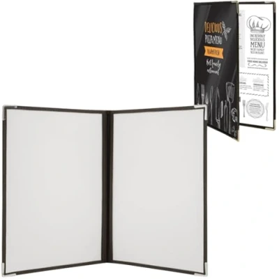Double sided menu holder Washable with soap and water Flexible and scratch resistant Stitched edging projects an elegant look whilst adding to the durability of the menu holder Fastened metal cornering adds to the style whilst providing extra resistance to wear and tear