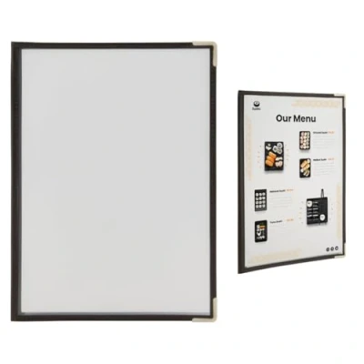Double sided menu holder Washable with soap and water Flexible and scratch resistant Stitched edging projects an elegant look whilst adding to the durability of the menu holder Fastened metal cornering adds to the style whilst providing extra resistance to wear and tear