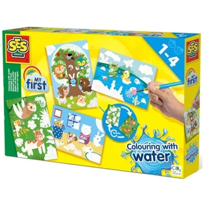 Reveal hidden animals with SES Creative's Colouring with Water - Hidden Animals, perfect for young children. Includes 4 colouring water cards and a brush, ideal for mess-free creative fun. Made from safe, non-toxic materials, suitable for children aged 1 and up. Encourages creativity and fine motor skills as toddlers paint with water and uncover hidden animals. Ideal for early learning and creative play, keeping toddlers entertained with mess-free painting., Manufacturer: SES Creative