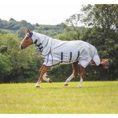 Ideal for sun-sensitive horses that need protection from biting insects. Upper section blocks 90%* of UV rays, extended neck provides protection even while grazing. Ultra-breathable side panels provide free airflow to keep the horse cool. Large belly flap, stretch ear panel and extra-large pleated tail flap provide maximum coverage for the horse.