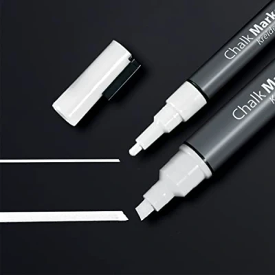 2 White chalk markers with a thin nib (line witdth of 1-5 mm) and with a thin rounded tip (line width of 1-2 mm) Perfect for Glass and all smooth, Glass-like surfaces: e.g | shop windows, mirrors, Glass Boards, etc. Fast-drying liquid chalk with excellent covering power The chalk can be wiped off cleanly using a damp or dry cloth Chalk marker pens also available in different colours