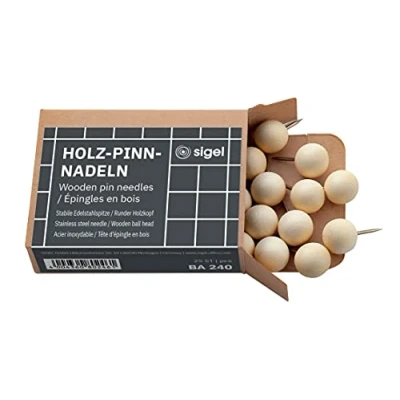 Agile, creative work on WhiteBoards, magnetic Glass Boards and pinBoards becomes so much easier with the SIGEL Board accessories | Discover the wide selection of products in our accessories range that can support you during project work or meetings. Wooden pins, Beige, for pinBoards (fabric, cork, etc.), large, round head, solid wood, stainless steel, ⌀ 12 mm, 25 Pieces. Sustainable, high-quality manufacture: made of light-colouRed solid wood and packed in natural paperBoard | Each piece is unique due to the natural wood grain For attaching presentation cards and much more to your pinBoard | Perfectly combinable with the other wooden Board accessories from SIGEL Box contents: 25x Wooden pins (BA240)