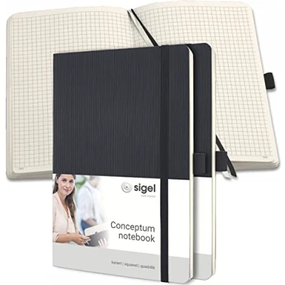 Conceptum business notebooks combine the best design and excellent quality; Many practical features such as the page numbering help you to organize yourself Notebook, squared (5 x 5 mm), approx DIN A5 (13,5 x 21 cm) in black, with 194 numbered pages (20 of which are perforated sheets) BEST DESIGN: Grooved softwave surface – unique to the touch and also visibly special; With high-quality chamois-colored 80g paper (PEFC-certified) EXCELLENT QUALITY: flexible and hard-wearing softcover; Manufactured using classic thread stitching for durability and perfect flatness of the book PRACTICAL FEATURES: table of content, page numbers, 20 perforated sheets, elastic fastener, pen loop, 2 page markers, quick pocket, archive pocket