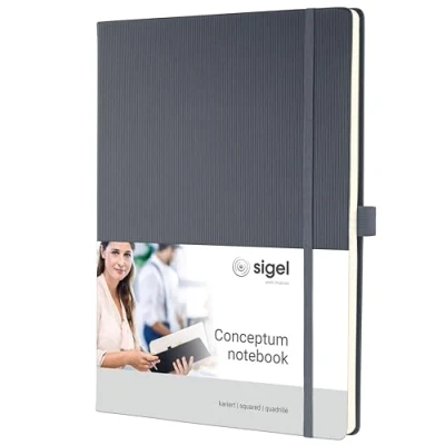 Conceptum business notebooks combine the best design and excellent quality; Many practical features such as the page numbering help you to organize yourself Large notebook, squared (5 x 5 mm), approx DIN A4 (21,3 x 29,5 cm) in dark grey, with 194 numbered pages (20 of which are perforated sheets) BEST DESIGN: Grooved softwave surface – unique to the touch and also visibly special; With high-quality chamois-colored 80g paper (PEFC-certified) EXCELLENT QUALITY: stable and hard-wearing hardcover; Manufactured using classic thread stitching for durability and perfect flatness of the book PRACTICAL FEATURES: table of content, page numbers, 20 perforated sheets, elastic fastener, pen loop, 2 page markers, quick pocket, archive pocket, adhesive labels for the front cover and spine