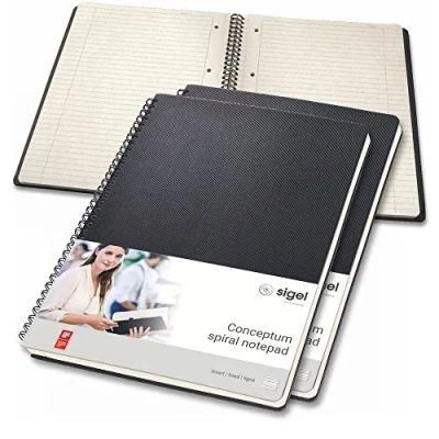 3 elegant black spiral notepads for business appointments or personal notes approx A4 (23.6 x 30.1 cm), lined, with 160 microperforated pages and 4-hole punching Made of top-quality, cream-coloured paper, 80 g/m² (PEFC-certified) The hard-wearing hardcover front and back have a grooved surface and are held in place with sturdy spiral binding Features: quick pocket, space for date at the top and blank margin